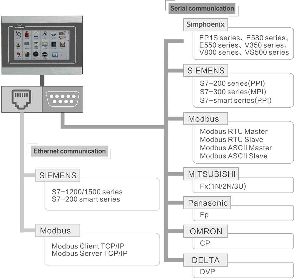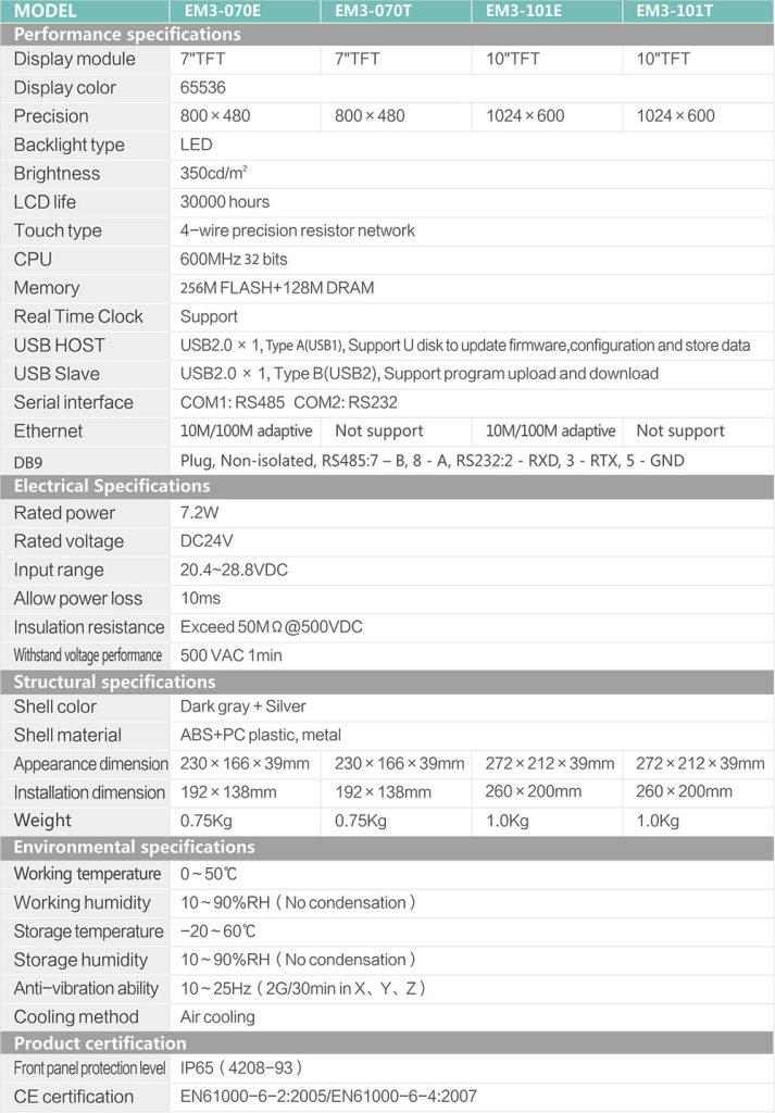 EM3 series human machine interface is a new HMI launched by Simphoenix. The new appearance of mental strip drawing is completely integrated into electrical control cabinet. It offers a better visual effect and excellent touch experience through Cortex A8 processor, 24-bite true-color display in collocation with configuration software Simphoenixface with rich functions.